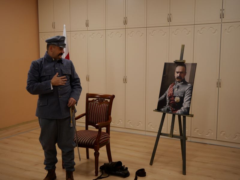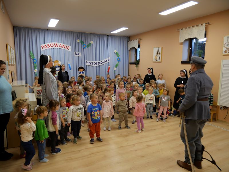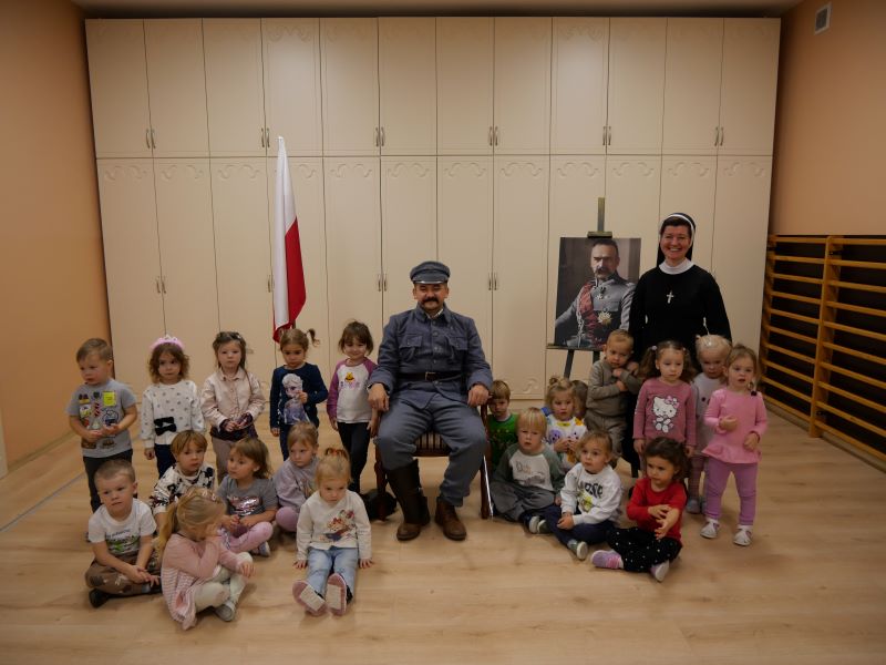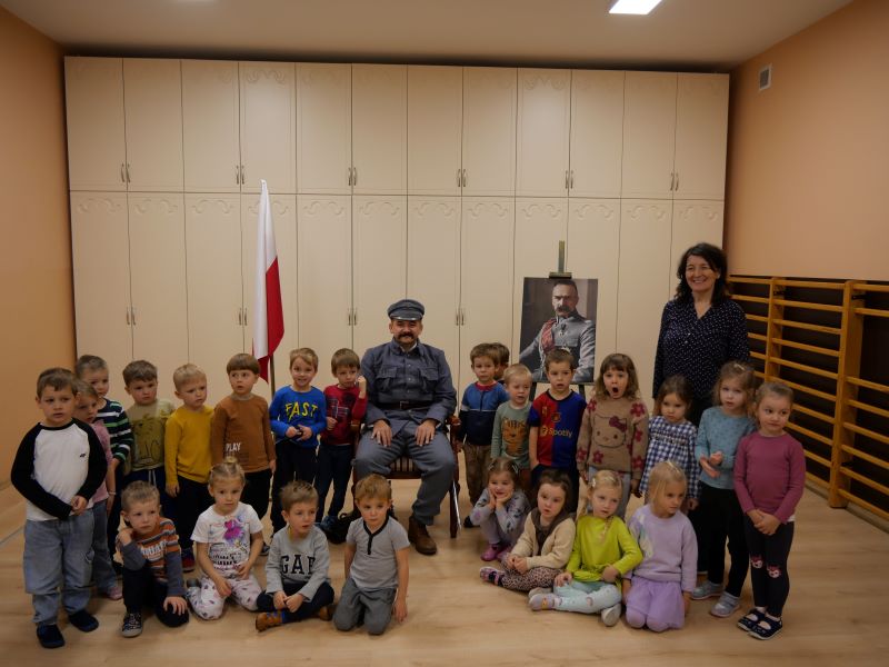 W naszym przedszkolu odbyło się wyjątkowe spotkanie z Józefem Piłsudskim – w tę historyczną postać wcielił się tata dwóch naszych przedszkolaków. Gość opowiedział dzieciom o życiu i dokonaniach marszałka, a także zaprezentował swój strój, wzbudzając ogromne zainteresowanie najmłodszych.