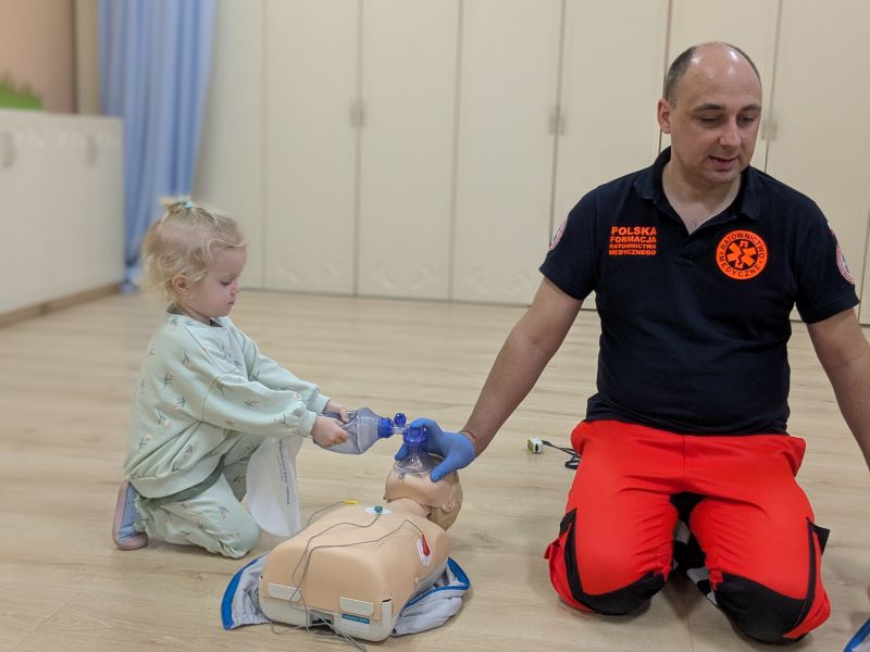 Największym zainteresowaniem cieszyły się zajęcia praktyczne. Dzieci miały okazję spróbować swoich sił na specjalnym manekinie – uczyły się, jak dostarczać tlen.