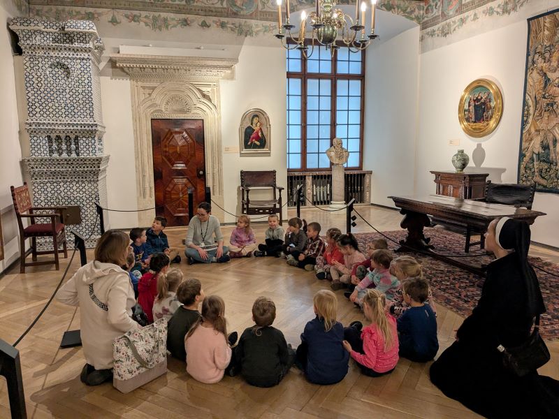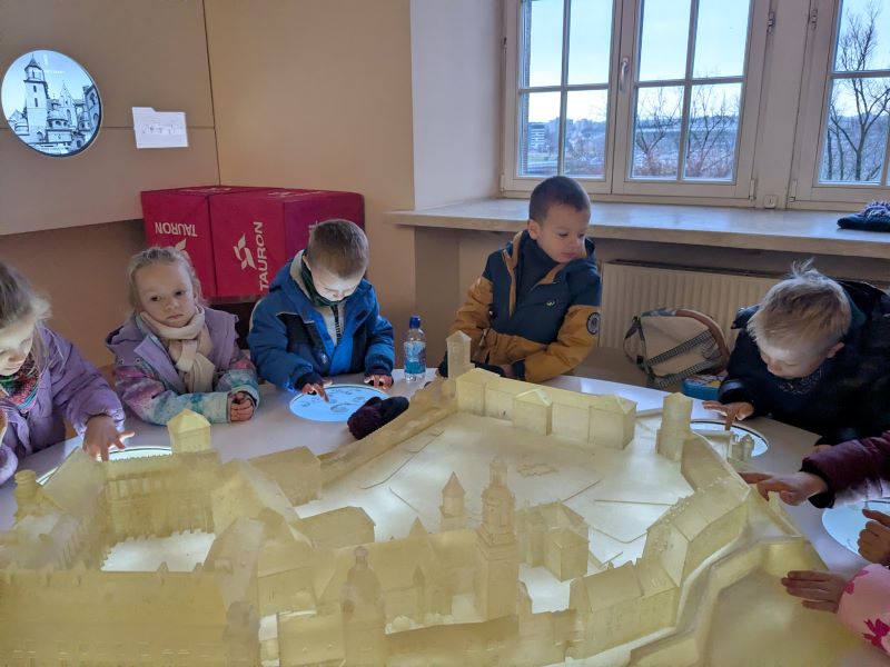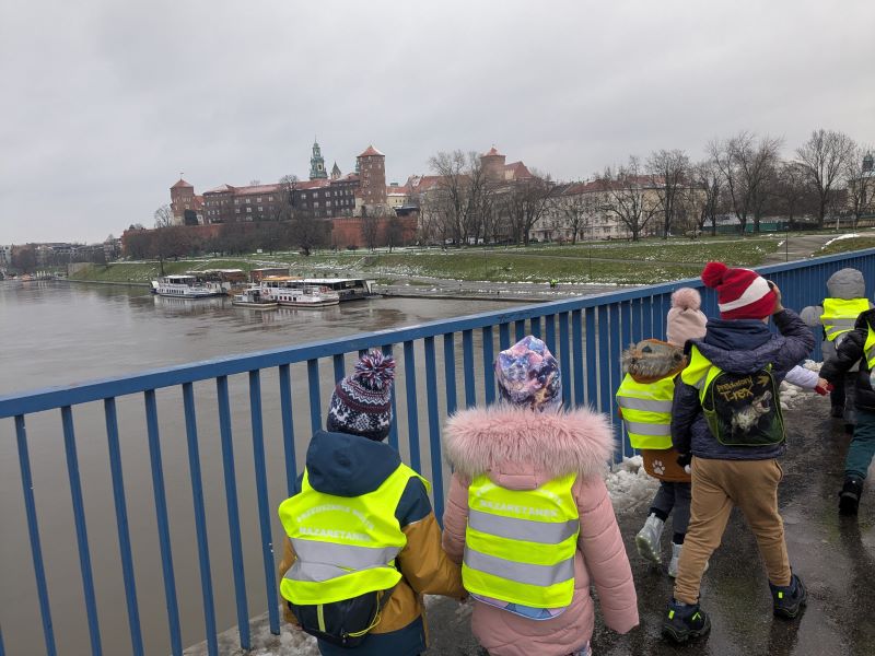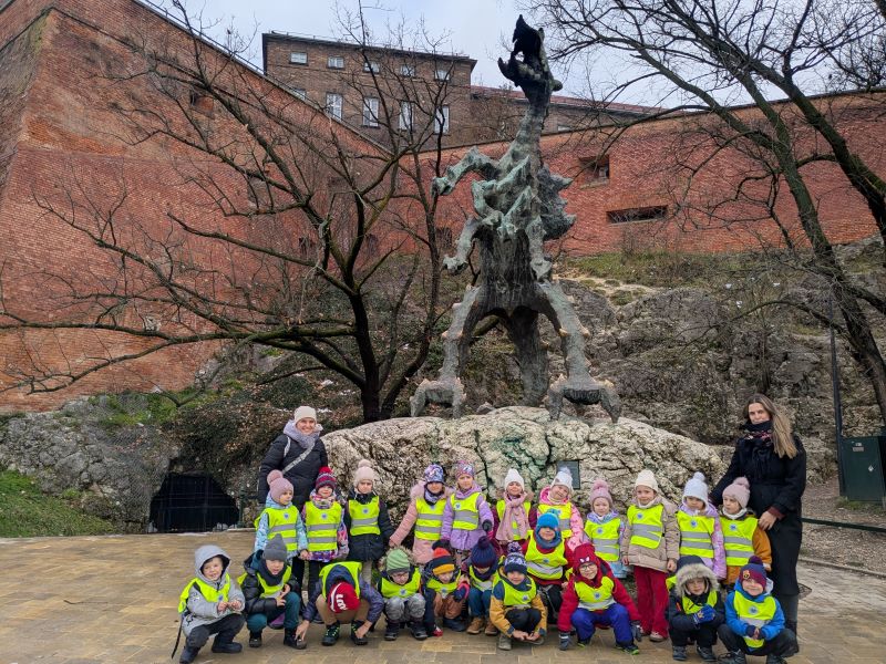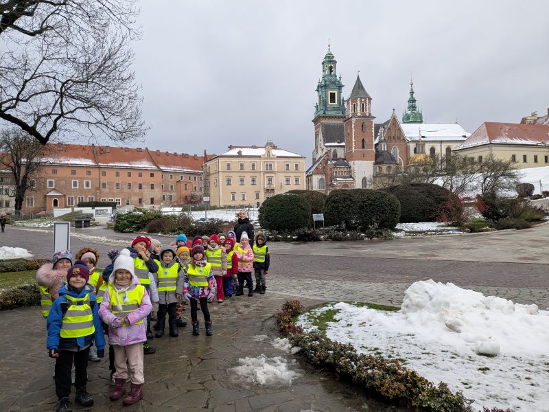 Dzieci z grupy 5-latków wzięły udział w wycieczce do Zamku Królewskiego na Wawelu, gdzie uczestniczyły w lekcji muzealnej pt. „Życie codzienne na zamku”. Przedszkolaki z dużym zainteresowaniem poznawały, jak żyli dawni królowie i dworzanie, oglądały komnaty zamkowe oraz dawne przedmioty codziennego użytku. Wycieczka była dla dzieci niezwykle ciekawym i radosnym doświadczeniem, które wzbogaciło ich wiedzę o historii Polski i pozwoliło przenieść się w świat dawnych czasów.